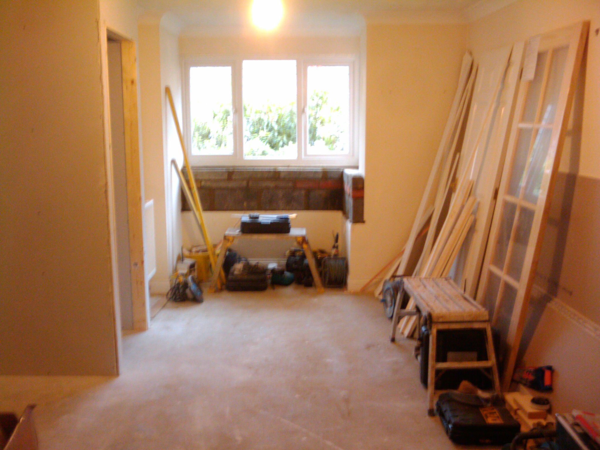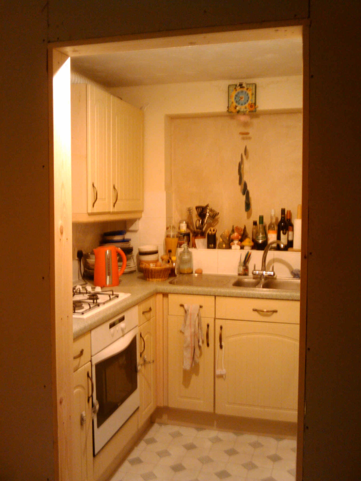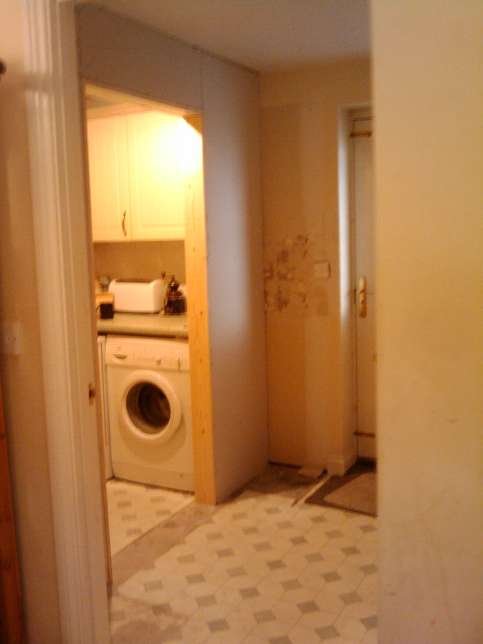 Most of the structural changes inside are now done. At least, the walls are up. A light switch stopped working yesterday next to a new partition wall (but an electrician will be moving it tomorrow) and then another light socket crumbled when we changed the bulb. Sounds like a few things need replacing. We also discovered a leak in the old kitchen, I think coming from the washing machine. Builder said the laek has been there for a while, but probably the feed to the washing machine as the was no dirt from the leak. The new utility wall is a as far back as it can go, meaning that it is a very tight squeeze for the units, but we should be able to have two 60cm units in there.