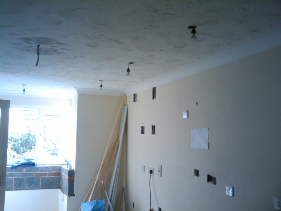 The kitchen sockets were all completed, the oven, extractor fan, fridge and dishwasher all have a socket and an isolator switch. 4 spot lights / down lights were installed, and light switches added and moved. All that is left is to move the oven supply over to the RCD side when the new oven arrives – I think that is the final job (apart from disconnecting the old oven). Oh, and installing a heat detector too.