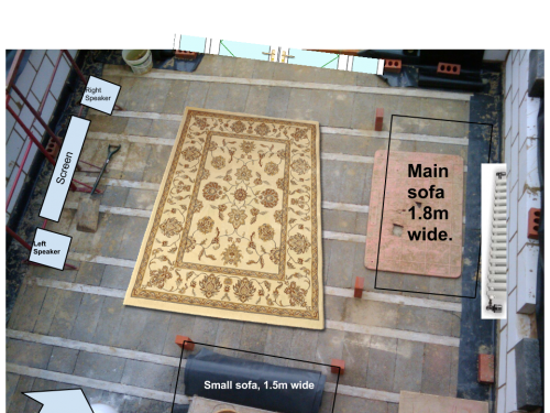Today I measured out the space needed for our 2 sofas, television and radiator. I used bricks to mark the corners of the sofas and a shovel to mark the position of the flat screen TV. Compare to the initial design idea below.