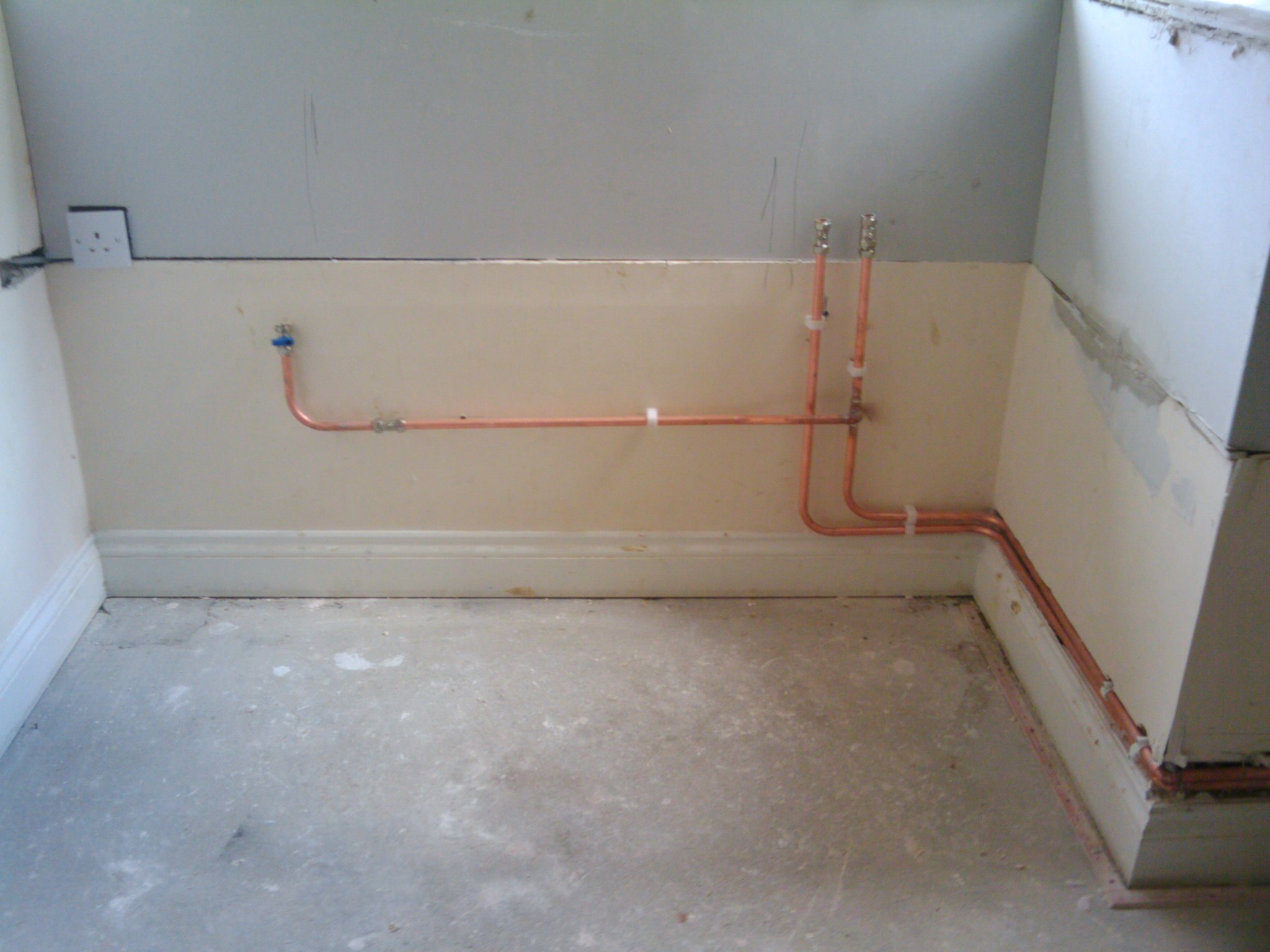 The plumber came round at 7pm to finish the work properly. The pipes are now deeper in the wall, although does not look as far as the kitchen fitter wants. But might be OK. However ……