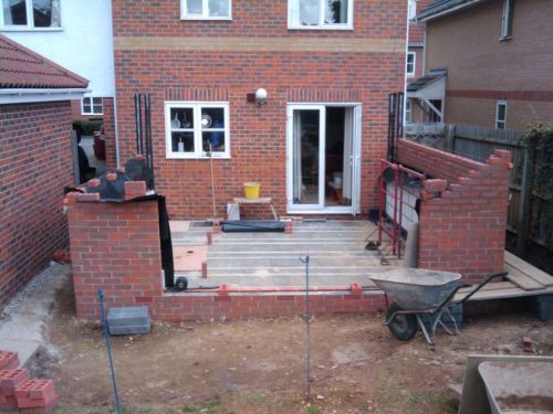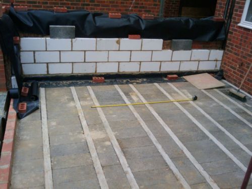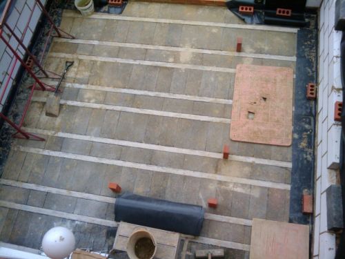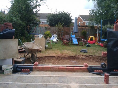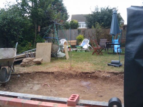 After the builders left on Day 13 I positioned bricks to mark the corners of the 2 sofas and the TV (a shovel) and TV stand / speakers (the red supports). The bricks on the door mark the actual door position (1.6m wide).